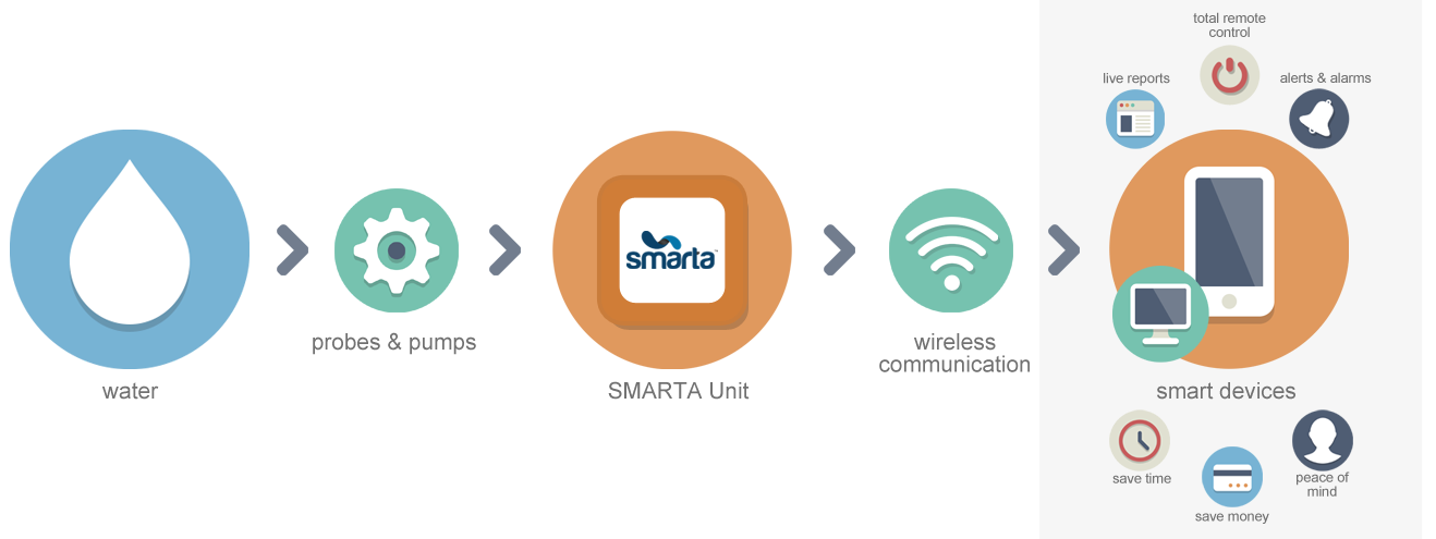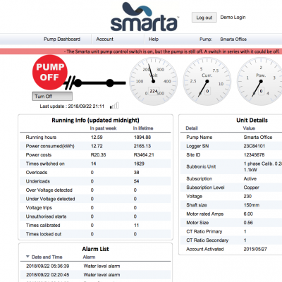 - Smarta will send alarms if dangerous conditions are experienced such as dry running, burst pipes, bad electrical supply or blocked irrigation system
